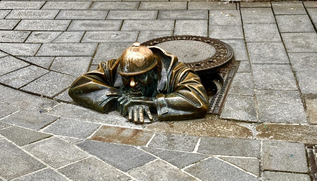 The main square was packed with post race activities and we stopped and watched a traditional Slovak dance group perform a few songs. Right after the main square we found our first target the sewer hole cover dude. It was a well executed and quirky piece of art that seemed to fit the vibe we felt for Bratislava.