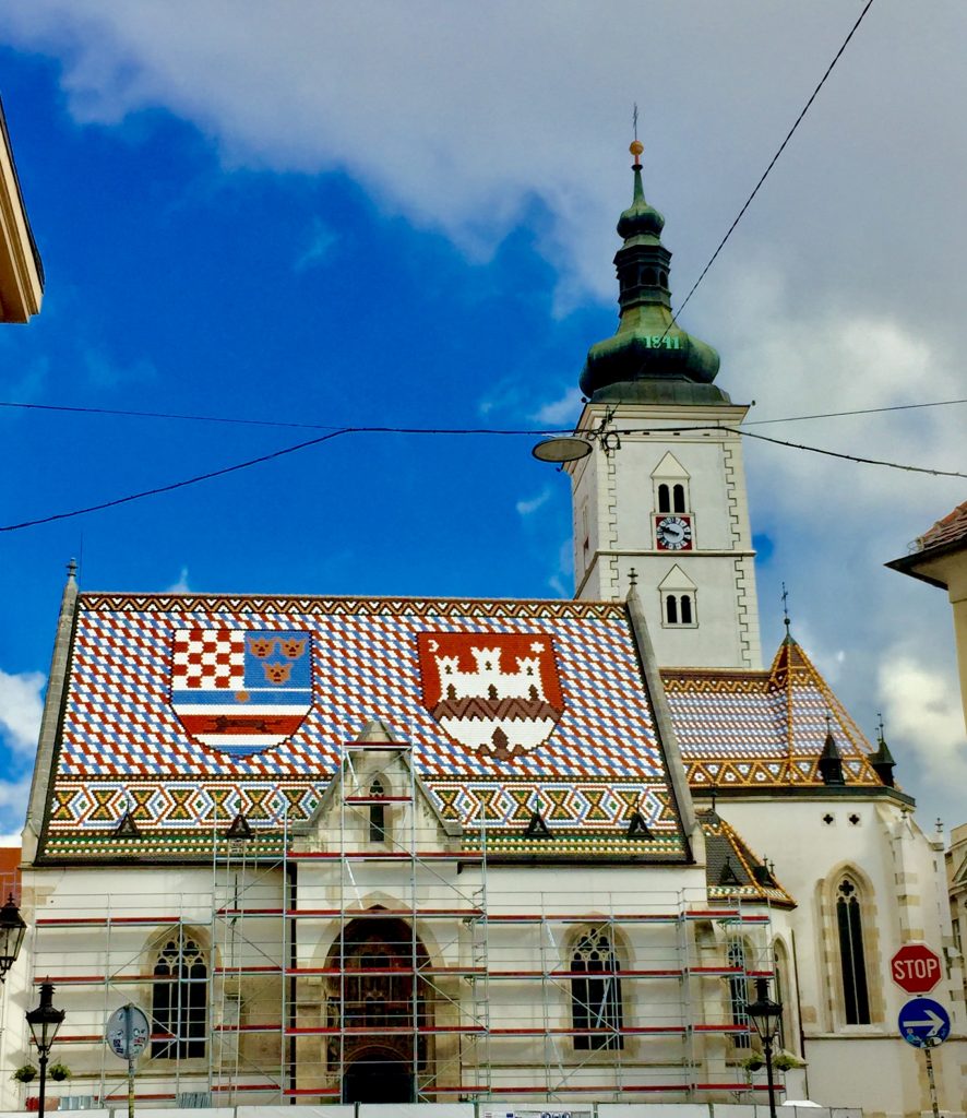The scaffolding was up and more restoration work was being done on St. Marks church. One coat of arms is for Croatia, and the other is Zagreb.